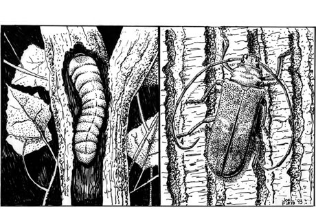 Lochmaelocles marmoratus larva and adult on cottonwoodPen and ink on vellum -
