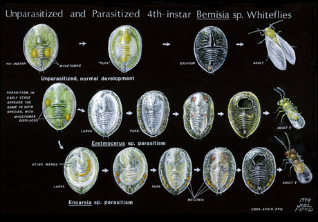 Parasitized Sweet Potato Whitefly PupaeColored pencil and gouache on posterboard -