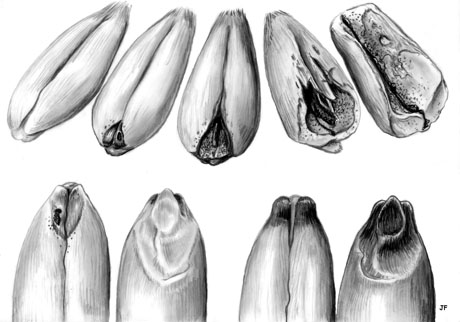 Wheat kernels with Karnal Bunt and Blackpoint diseaselcarbon dust on frosted drafting film