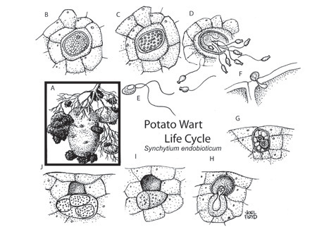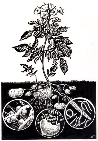 Pale Cyst Nematode, Globodera pallida, on potatopen & ink on clayboard