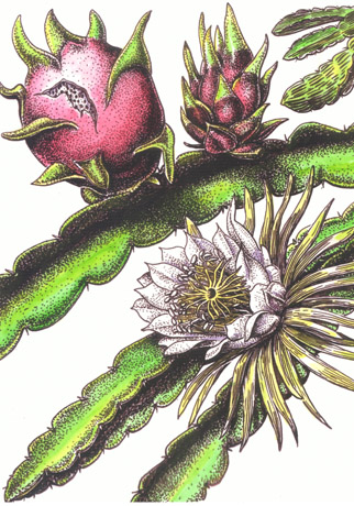 Dragon Fruit, Hylocereus undatusPen and ink on scratchboard, watercolor -