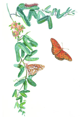 Mexican Passionvine and Gulf FritillaryWatercolor -